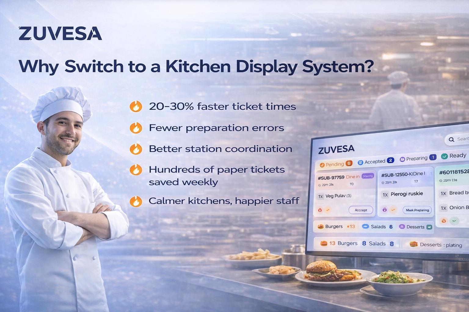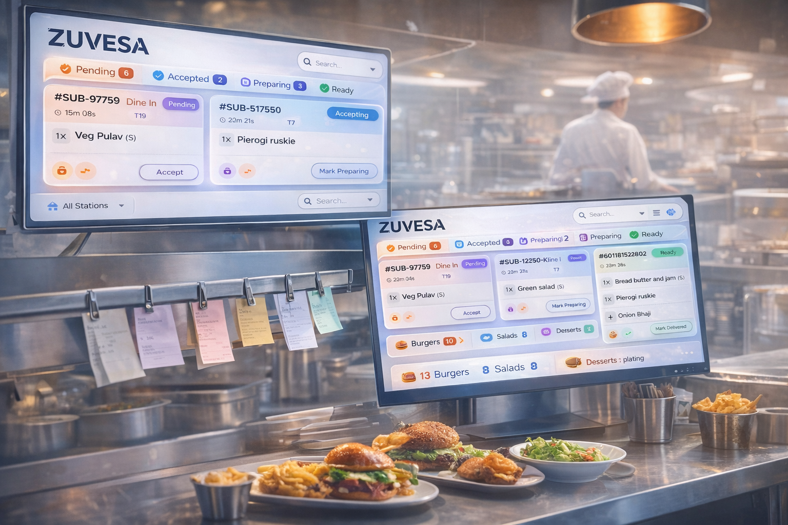 A Kitchen Display System organizes kitchen orders digitally with real-time updates, allergen warnings, and smart filtering. Discover how Zuvesa KDS eliminates paper tickets and reduces mistakes.