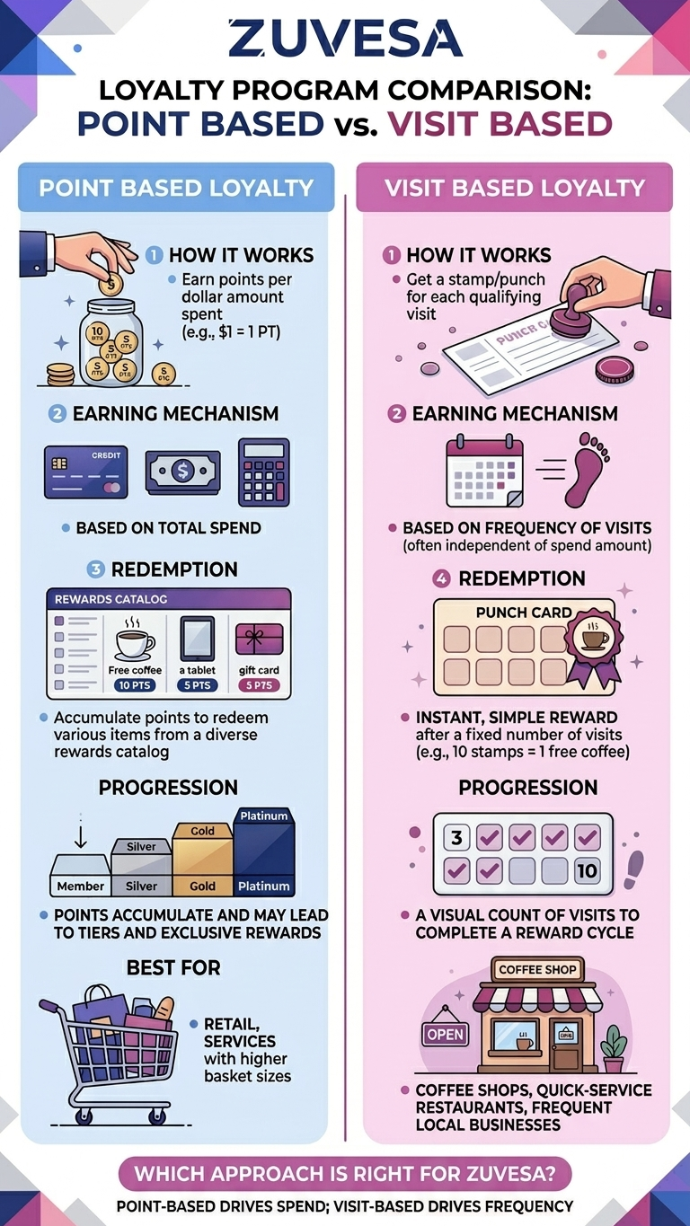 Visits-based programs work better for high-frequency, lower-ticket venues - coffee shops, bakeries, lunch spots. When the average check is fairly consistent, tracking visits is simpler and the "every 10th coffee" model is easy for customers to understand and maintain motivation around.